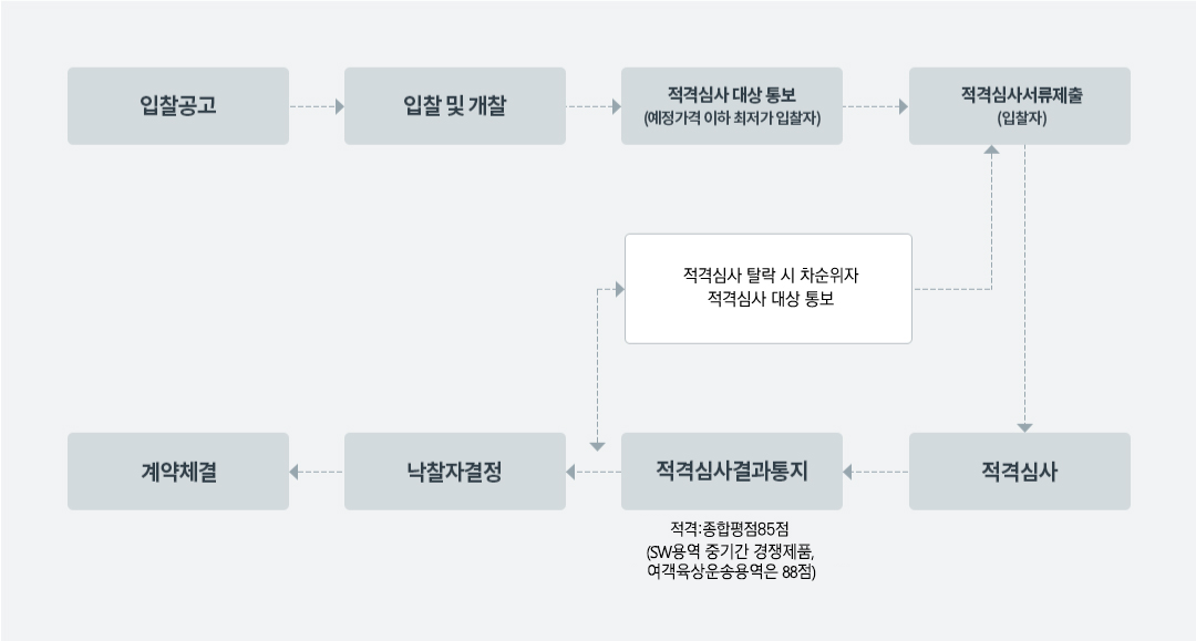 일반경쟁을 원칙으로 계약이행능력이 있는 자 중 가장 유리하게 입찰한 자가 선정될 수 있도록 규격을 검토하고, 관련 업계의 의견 수렴을 위한 구매규격(과업내용서, 제안요청서 등)을 사전에 5일간[소프트웨어사업(기획, 운영·유지관리 사업 등은 제외) 중 총 사업규모(추정가격+ 부가가치세)가 5억원 이상 사업은 10일, 긴급을 요하는 경우 3일 이상] 공개한다. 그러나 계약의 목적, 성질, 규모 등을 고려하여 필요하다고 인정되면 참가자의 자격을 제한하거나 참가자를 지명(指名)하여 경쟁에 부치거나 수의계약(隨意契約)으로 구매할 수 있다.